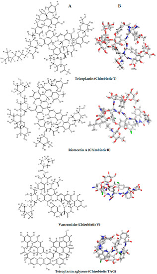 - Berthod, A.; Chen, X.; Kullman, J.P.; Armstrong, D.W.; Gasparrini, F.; D’Acquaric, I.; Villani, C.; Carotti, A. Role of the carbohydrate moieties in chiral recognition on teicoplanin-based LC stationary phases. Anal. Chem. 2000, 72, 1767–1780. [Google Scholar] [CrossRef] [PubMed]