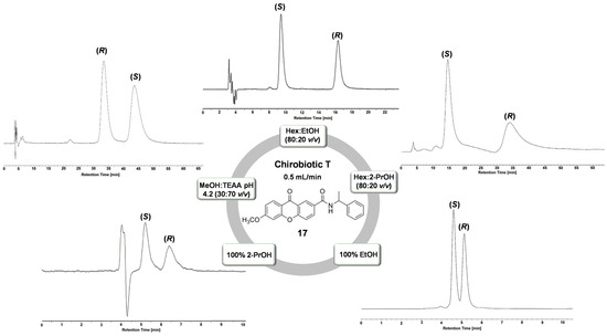 Considering elution order of all the enantioseparated xanthonic analytes, the (R)-enantiomer was the first to elute on the ChirobioticTM TAG column. The only exception was also observed for analyte 17.