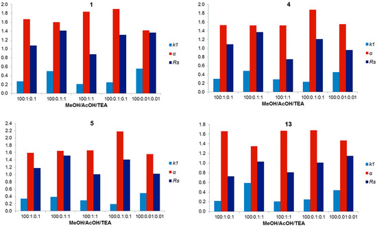 Effect of the different proportion of AcOH and TEA in MeOH on chromatographic parameters k1, α and RS for analytes 1, 4, 5 and 13.