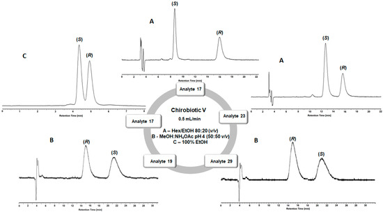 For example, the ChirobioticTM T column presented very high enantioseparation capabilities for analytes 15 and 23, with α values of 1.33 and 2.83, respectively, and RS values of 2.46 and 6.79, respectively, using MeOH:TEAA at pH 4.2 (30:70 v/v) as mobile phase. These chromatographic results were also the best achieved for both analytes in this column. Moreover, the proportion 30:70 v/v of MeOH:TEAA was the optimum for the majority of the obtained enantioseparations.