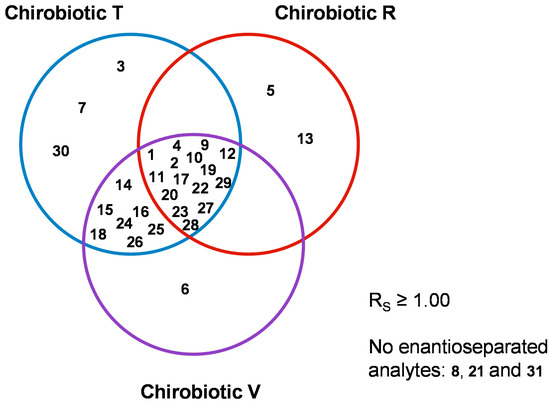 Diagram considering the xanthonic analytes enantioseparated by ChirobioticTM T, R and V columns, with resolution factors ≥1.00. ChirobioticTM TAG was not included considering its poor enantioselectivity for the evaluted analytes.