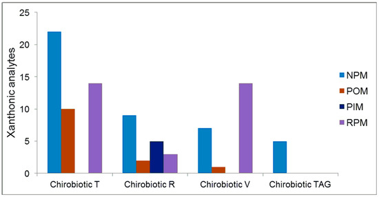 After the systematic study of enantioseparation by LC under multimodal elution conditions, ChirobioticTM T demonstrated to be the most suitable for the xanthonic analytes evaluated. In fact, twenty-five out of thirty-one xanthonic analytes (81%) were enantioseparated with RS values ≥ 1.00 (Figure 6).