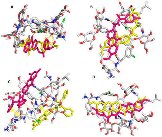 Analyte 1 (A), Analyte 14 (B), Analyte 30 (C), and Analyte 18 (D), docked on teicoplanin selector. Chiral selectors are represented in sticks with C, O, N, and Cl atoms colored in grey, red, blue, and green, respectively. (S) and (R) enantiomers are represented with magenta and yellow sticks, respectively. Hydrogen interactions and π-stacking interactions are represented with dashes and double arrow, respectively.