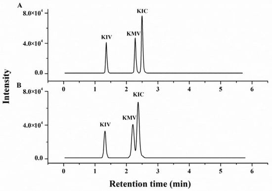 The branched-chain amino acids (BCAAs) leucine, isoleucine, and valine are three essential amino acids that cannot be synthesized by animals and must be obtained from foods [1,2,3]. As a result of the stimulatory effect of BCAAs on protein synthesis and direct effects on glucose transport and insulin secretion, investigations into the metabolism of BCAAs have become a popular research area in recent years, with particular emphasis on the branched-chain keto acids (BCKAs) [4,5,6,7,8,9,10]. The BCKAs are derived from the initial step in the catabolism of BCAAs via BCAA amino transferase, which transfers the amino group of BCAAs to α-ketoglutarate to form the BCKAs (including α-ketoisocaproate (KIC, ketoleucine), α-keto-β-methylvalerate (KMV, ketoisoleucine) and α-ketoisovalerate (KIV, ketovaline)) in the muscle [11,12,13]. After BCAAs are catalyzed by amino transferase, BCKAs can be irreversibly oxidized to isovaleryl-CoA, isobutyryl-CoA and 2-methylbutyryl-CoA via the enzyme branched-chainketo acid dehydrogenase (BCKDH) [14,15,16]. The effect of BCKAs on stimulating protein synthesis has been reported [17,18]. And when the BCKDH complex is mutated and defective, the BCKAs will accumulate in tissues resulting in development of the maple syrup urine disease (MSUD) in animals [19]. Since BCKAs have such an important effect on the metabolic and nutritional state of animals, accurate determination of BCKAs in biological samples is highly valuable.