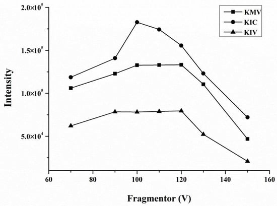 Intensity of 3 branched-chain keto acids (KIV: α-ketoisovalerate; KMV: α-keto-β-methylvalerate; KIC: α-ketoisocaproate) mixed standard solution (5 μmol/L for each compound) in different fragmentor (V).
