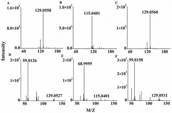 The mass spectra of the branched-chain keto acids standards using HPLC-Q-TOF/MS. (A) Full scan mass spectra of α-keto-β-methylvalerate (KMV); (B) Full scan mass spectrum of α-ketoisovalerate (KIV); (C) Full scan mass spectrum of α-ketoisovalerate (KIC); (D) MS/MS spectrum of KMV; (E) MS/MS spectrum of KIV; (F) MS/MS spectrum of KIC.