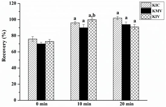 The influence of different ultrasonic time on the recoveries of three BCKAs (KIV: α-ketoisovalerate; KMV: α-keto-β-methylvalerate; KIC: α-ketoisocaproate). a, b Means the same compounds different significantly (p < 0.05).