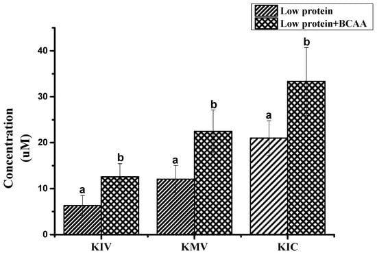 The influence of the addition of BCAA on the concentration of three BCKAs in serum of pigs fed different levels of dietary BCAA (KIV: α-ketoisovalerate; KMV: ketoisoleucine; KIC: α-ketoisocaproate). a, b Means the same compounds different significantly (p < 0.05).