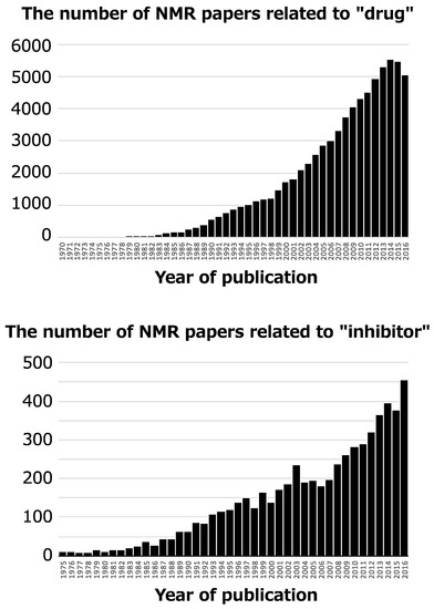 NMR has been used for an enormous number of pharmaceutical studies since the 1970s, and the number of NMR papers with the key words “drug” and “inhibitor” is increasing (Figure 1). Typical NMR application is discovery of specific inhibitor and its binding mode analysis [4], and remarkable one is discovery of allosteric regulator by NMR-based screening and its conformational analysis [5,6]. For such studies, many NMR methods have been developed due to the advantages of NMR [7]. These advantages include: both chemical compounds and biomolecules give NMR signals, the binding mode between chemical compounds and biomolecules, such as the tertiary structures, conformational changes, and interaction interface, can be determined at an atomic resolution, and NMR performs well for weak intermolecular interactions with dissociation constant (Kd) in the μM~mM range.