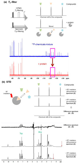 Protein-ligand interactions can be investigated by examining the increase in the transverse relaxation rate of the ligand NMR signal. The transverse relaxation rate is accelerated by the decreased rotational diffusion rate and increased rotational correlation time due to protein-ligand binding [19]. In T2- and T1ρ-filter [20,21,22] experiments (Figure 2a), protein-ligand binding was detected by the decrease in resonance intensity of the ligand NMR signals. This intensity reduction is mainly from the apparent line-broadening induced by the exchange process between the free and bound states.