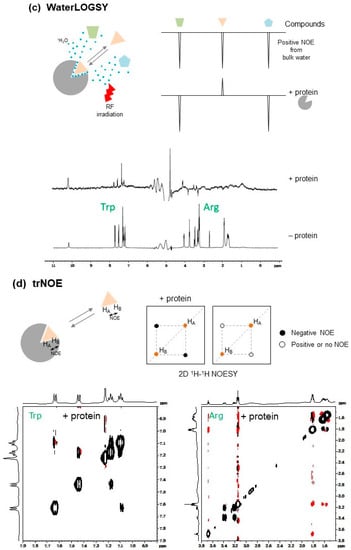 The water-ligand observed via gradient spectroscopy (WaterLOGSY) [42] method, and its related solvent accessibility, ligand binding, and mapping of ligand orientation by NMR spectroscopy (SALMON) technique [43], are water-saturating STD-like methods. These methods use the characteristic of the saturation transfer efficiency being higher for hydration water of a protein compared to free bulk water (Figure 2c). Mainly due to the difference in τc of the water, the sign of the NOE cross-peaks between the water and ligand can be altered; positive NOE cross-peaks can be observed between the free bulk water and ligand, and negative NOE cross-peaks can be observed between protein-bound hydration water and ligand (Figure 2c).