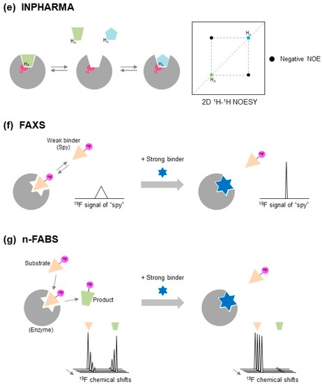 The n-FABS method is an NMR-based fragment screening approach that uses the enzymatic activity of the target protein (Figure 2g). In this approach, an enzymatic activity assay is performed typically using trifluoromethyl (CF3)-tagged known substrates of the protein enzyme. As a result, the distinct chemical shifts of the 19F signals of CF3 can be observed for the CF3-tagged substrate and products (Figure 2g). When high-affinity ligand co-exists with CF3-tagged substrates, the enzymatic reaction can be satisfied, leading to a loss in 19F chemical shifts derived from the products [16,59]. The n-FABS method is a powerful approach that can identify a new ligand that binds to the active center of a target protein enzyme.
