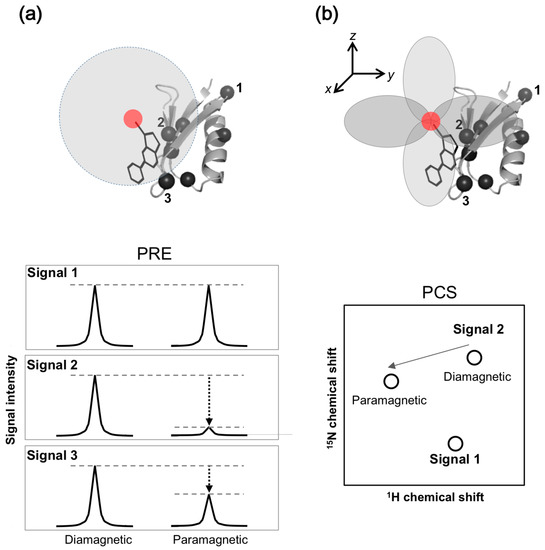 The paramagnetic NMR approach is dependent on the distance (r−6 and r−3 for PRE and PCS, respectively) between the observing nucleus and the paramagnetic center. Distance information provided by paramagnetic NMR, up to 30 and 40 Å for PRE and PCS, respectively, is significantly longer than inter-proton nuclear Overhauser effect (NOE) of up to 6 Å. Additionally, PCS provides angular information between the observing nucleus and paramagnetic center. This information is widely used to investigate inter-molecular interactions, especially for ephemeral or short-lived but biologically significant conformers, such as transient “intermediates” or “activated” forms of target proteins. In some cases, the tertiary structure of a protein and protein-ligand complexes were determined [26,27,28,29].