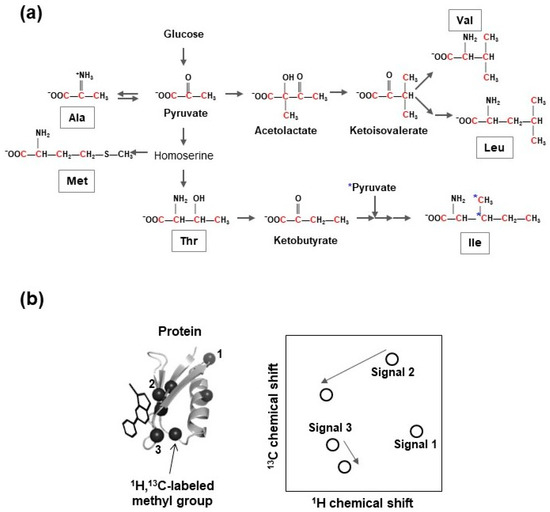 Fractional 13C-labeling methods were developed mainly using sparsely 13C-labeled glucose [102,103], glycerol [104,105], pyruvate [106,107,108], acetate [109], or erythrose [110] as carbon sources. Methyl group-selective 1H,13C-incorporation of threonine residues was accomplished by applying a fractional 13C-labeling scheme using 2-[13C] glycerol and NaH13CO3 [104,108,111]. Several NMR measurement techniques have identified protein-ligand binding sites using amino acid-selective or site-specific isotope enriched protein samples [76,77].