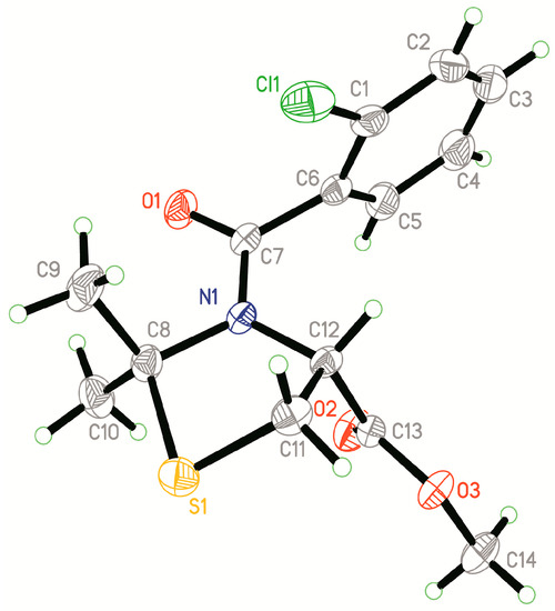 The synthetic route of the title compound 4, is shown in Scheme 3. l-cysteine methyl ester hydrochloride (4.29 g, 25 mmol), an appropriate ketone (25 mmol), and Et3N (5.05 g, 50 mmol) were stirred for 2 h in toluene (20 mL) at 65 °C under nitrogen atmosphere. Benzoyl chloride or dichloroacetyl chloride (25 mmol) was added dropwise to the reaction mixture at 0 °C and reacted for 1 h. The mixture was washed with saturated NaCl solution (3 × 20 mL) and dried using anhydrous sodium sulfate. The solvent was removed under reduced pressure to yield crude methyl (R)-N-benzoyl/dichloroacetyl-thiazolidine-4-carboxylate (4). The title compounds were purified by column chromatography. The spectra data of compound 4 are presented in Supplementary Materials (Figures S2–S77).