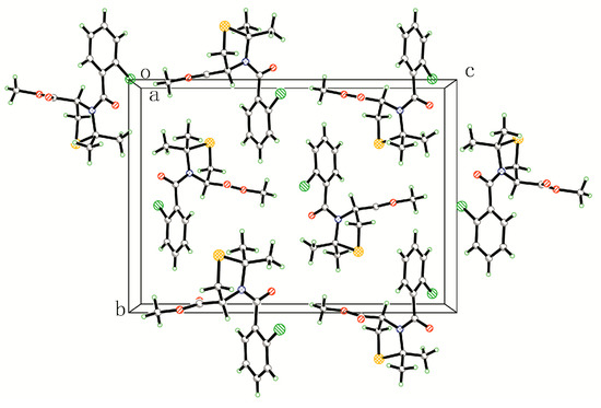 As shown in Figure 1, in the structure of methyl (R)-3-(o-chlorobenzoyl)-2,2-dimethylthiazolidine-4-carboxylate, the dihedral angle of the phenyl (C1/C2/C3/C4/C5/C6) and thiazolidine (N1/C8/S1/C11/C12) is 70.25°. The X-ray structure indicated that Compound 4q contained a chiral carbon, C12, with R configuration. However, no obvious intermolecular hydrogen bonds and π–π interactions were observed in the structure of Compound 4q (Figure 2).