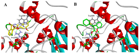 The docking modeling is revealed in greater detail in Figure 4. Chlorimuron-ethyl docked to ALS between the two active site residues (Arg 380 and Trp 586) and binding interactions included two hydrogen bonds between the oxygen atom and Arg 380. Compound 4e also bound to the target site by hydrogen bonds. Obviously, three hydrogen bonds were formed between Compound 4e and Arg 380, resulting in a stable combination. Upon application, 4e possibly competed with chlorimuron-ethyl at the target active site by stopping the herbicide from acting on the ALS active pocket, which caused chlorimuron-ethyl to lose its effect. This function may be the detoxification mechanism of the title compound.