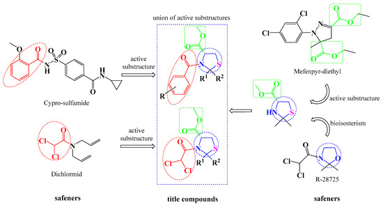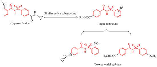 Over the past decade, novel herbicide safeners have been synthesized using a structure-based bioisosterism design, which is a useful strategy for structural modification [11]. On the other hand, active substructure combinations have also proved to be very significant for synthesizing novel safeners, and these combinations can provide useful information about chemical substituents. Novel acylsulfamoylbenzamide safeners with excellent bioactivity have been designed using the previously developed safener cyprosulfamide, as the leading compounds based on similar active substructures (Scheme 1) [12]. Two compounds based on acylsulfamoylbenzamide have better bioactivities than cyprosulfamide and could serve as leading compounds in the design of new safeners. In addition, isoxadifen-ethyl was designed by combining the active substructures of known active molecules [13]. Furthermore, molecular docking has been performed to compare the binding affinities of herbicides and the target compound with the target enzyme (i.e., ALS) [14]. The binding energy was calculated, which helped researchers predict the mechanism of the herbicide safener [15].