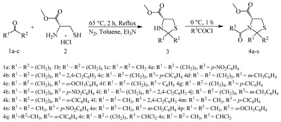 In this paper, a one-pot synthesis route was designed (Scheme 3) and the effects of solvents and cyclization temperature were investigated. l-cysteine methyl ester hydrochloride, 2, was cyclized with ketones, 1, to generate thiazolidines, 3, with Et3N as the attaching acid agent under nitrogen atmosphere. The title compounds, 4, were prepared by direct acylation of the corresponding thiazolidine compound with an acyl chloride. Notably, use of toluene as the solvent provided better yields than CH2Cl2, THF, and CHCl3. In addition, the effect of temperature variation on the cyclization was determined by increasing the temperature from 25 to 75 °C. It was found that the best yields were obtained when controlling the cyclization temperature at 65 °C.