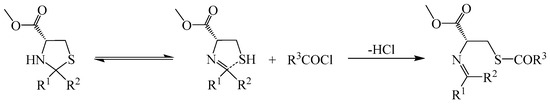 - Takata, T.; Tamura, Y.; Ando, W. New synthetic utility of singlet oxygen in sulphide photo-oxidation: Selective and stereospecific hydroxylation α to sulphur of 4-substituted 3-benzoyl-2,2-dimethylthiazolidines. Tetrahedron 1985, 41, 2133–2137. [Google Scholar] [CrossRef]