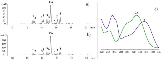 (a–c) HPLC chromatogram of Ruppia cirrhosa (a) and Ruppia maritima (b) recorded at 360 ± 10 nm; (c) UV-Vis spectrum of isorhamnetin 3-O-β-d-galactopyranoside (5) and chicoric acid (CA). See Figure 2 for structures, 1–8 and CA. * unidentified caffeoyl unit.