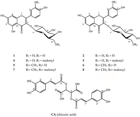 The HPLC profile (Figure 1) of the crude extract of R. cirrhosa detected at 360 ± 10 nm revealed one phenolic acid and eight flavonoids (Figure 2). After purification of the concentrated extract by Amberlite XAD-7 (Sigma-Aldrich, St. Louis, MO, USA) chromatography, the compounds were isolated by preparative HPLC and analyzed using high resolution LC‒MS and 1D and 2D NMR spectroscopy. Their physiochemical and spectral data were compared to previously reported values in literature, and the compounds were identified as quercetin 3-O-β-d-galactopyranoside (1) [19,20,21], quercetin 3-O-β-d-glucopyranoside (2) [19,21,22], quercetin 3-O-β-d-(6″-O-malonyl)galactopyranoside (4) [23], isorhamnetin 3-O-β-d-galactopyranoside (5) [24,25], isorhamnetin 3-O-β-d-glucopyranoside (6) [22,25,26], isorhamnetin 3-O-β-d-(6″-O-malonyl)galactopyranoside (7) [23,27], isorhamnetin 3-O-β-d-(6″-O-malonyl)-glucopyranoside (8) [27] and chicoric acid (CA) [28]. Quercetin 3-O-β-d-(6″-O-malonyl)-glucopyranoside (3) was identified by comparison with an analytical standard (≥85% (HPLC), Sigma-Aldrich).