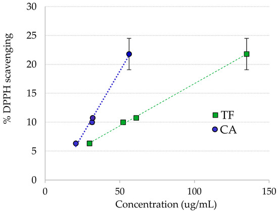 DPPH· radical scavenging vs. concentration of chicoric acid (CA) and total flavonoids (TF) in Ruppia cirrhosa crude extracts.