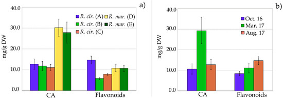 (a) Flavonoid and chicoric acid (CA) content in leaves of Ruppia cirrhosa (R. cirr.) and Ruppia maritima (R. mar.) collected from different localities; (b) Flavonoid and chicoric acid (CA) content in leaves of Ruppia cirrhosa collected in October 2016, March 2017 and August 2017. Amounts are expressed in mg/g (mean value ± SD, n = 4) dry weight, based on quercetin 3-O-β-d-glucopyranoside (flavonoids) or caffeic acid (CA) equivalents.