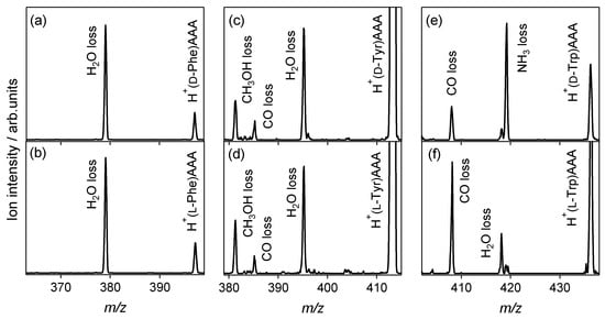 Figure 1 shows the CAD spectra of the protonated noncovalent complexes of aromatic amino acids with l-alanine tripeptide. The spectra of heterochiral H+(d-Trp)AAA and homochiral H+(l-Trp)AAA are also shown for comparison, which are cited from our previous paper [35]. For the Phe and Tyr shown in Figure 1a–d, the H2O loss from the noncovalent complex is the main dissociation pathway, and no reactivity difference between the enantiomers is observed in the spectra. For the heterochiral H+(d-Trp)AAA shown in Figure 1e, the NH3 loss is the main dissociation pathway, whereas the H2O-elimination product is observed in the spectrum of homochiral H+(l-Trp)AAA, as with Phe and Tyr. The loss of either NH3 or H2O in the CAD is attributed to the protonation site in the noncovalent complex [35]. The protonation site of heterochiral H+(d-Trp)AAA is the amino group of d-Trp, and the NH3 loss occurs from H+(d-Trp). The NH3 loss from the protonated aromatic amino acids is the primary dissociation pathway in CAD [39]. The H2O losses observed in all the spectra except that for d-Trp indicate that the proton is attached to the l-alanine tripeptide in each noncovalent complex. H2O loss is the main pathway for the CAD of protonated polyalanines, where the NH3-elimination product is not observed [40]. The dehydration occurs at the carbonyl group or amino bond of the protonated polyalanines.