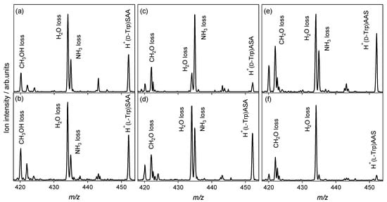 Collision-activated dissociation spectra of protonated noncovalent complexes of tryptophan with l-serine-containing tripeptides: (a) H+(d-Trp)SAA, (b) H+(l-Trp)SAA, (c) H+(d-Trp)ASA, (d) H+(l-Trp)ASA, (e) H+(d-Trp)AAS, and (f) H+(l-Trp)AAS (m/z 452).