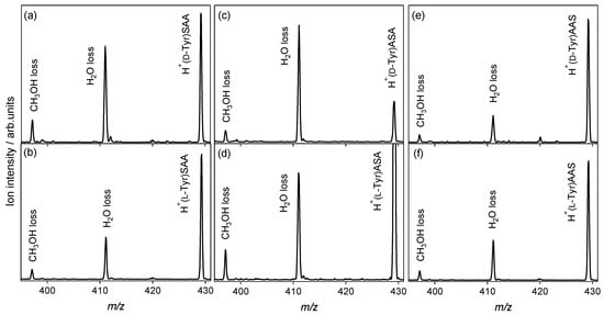 Collision-activated dissociation spectra of protonated noncovalent complexes of tyrosine with l-serine-containing tripeptides: (a) H+(d-Tyr)SAA, (b) H+(l-Tyr)SAA, (c) H+(d-Tyr)ASA, (d) H+(l-Tyr)ASA, (e) H+(d-Tyr)AAS, and (f) H+(l-Tyr)AAS (m/z 429).