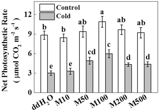 Net photosynthetic rate (Pn) as influenced by various concentrations of exogenous melatonin following cold stress. Two years-old tea (Camellia sinensis L.) seedlings of Longjing 43 were pretreated with various concentrations of melatonin (10, 50, 100, 200, and 500 µM) and challenged with cold stress (−5 °C for 3 h) in temperature-controlled chambers. Pn was measured in mature tea leaves after a 3 h recovery from cold stress. Each data point presents the mean of six replicates (± S.D. (standard deviation)). Means denoted by different letters are significantly different (p < 0.05) based on the Tukey’s test.