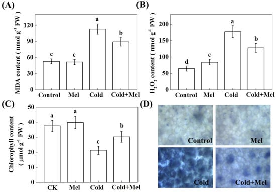 Effect of melatonin application on different stress-related parameters. (A) malondialdehyde (MDA) content; (B) hydrogen peroxide (H2O2) content; (C) chlorophyll content and (D) in situ O2●− accumulation by NBT staining. Mel, melatonin. Each data point presents the mean of six replicates (± S.D. (standard deviation)). Means denoted by different letters are significantly different (p < 0.05) based on the Tukey’s test.