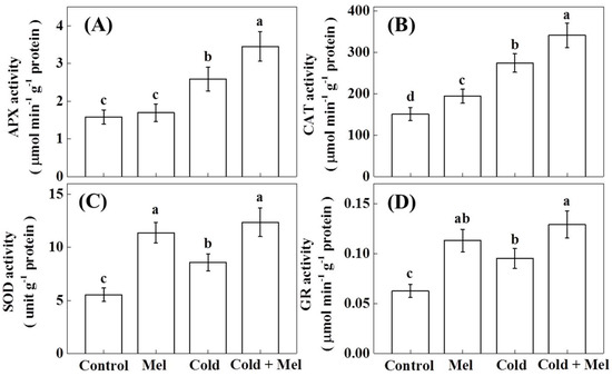 Effect of melatonin application on (A) ascorbate peroxide (APX), (B) superoxide dismutase (SOD), (C) catalase (CAT), and (D) glutathione reductase (GR) activities in tea leaves in the presence or absence of cold stress treatment. Mel, melatonin. Each data point presents the mean of six replicates (± S.D. (standard deviation)). Means denoted by different letters are significantly different (p < 0.05) based on the Tukey’s test.