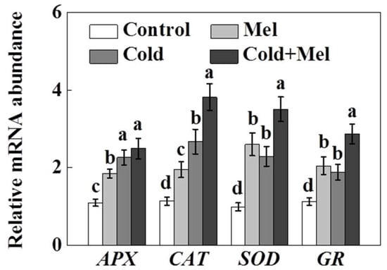 Effect of melatonin application on the transcripts of genes for ascorbate peroxide (APX), superoxide dismutase (SOD), catalase (CAT), and glutathione reductase (GR) in tea leaves in the presence or absence of cold stress treatment. Mel, melatonin. Each data point presents the mean of six replicates (± S.D. (standard deviation)). Means denoted by different letters are significantly different (p < 0.05) based on the Tukey’s test.