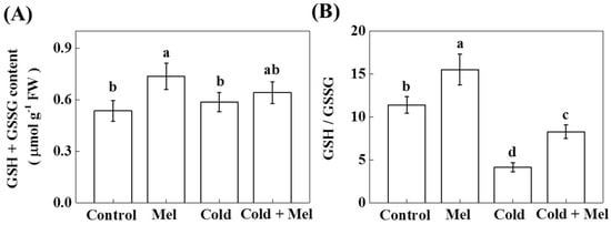 Effect of melatonin application on (A) glutathione content and (B) redox status in tea leaves under normal and cold stress conditions. Mel, melatonin. GSH, reduced glutathione. GSSG, oxidized glutathione. Each data point presents the mean of six replicates (± S.D. (standard deviation)). Means denoted by different letters are significantly different (p < 0.05) based on the Tukey’s test.