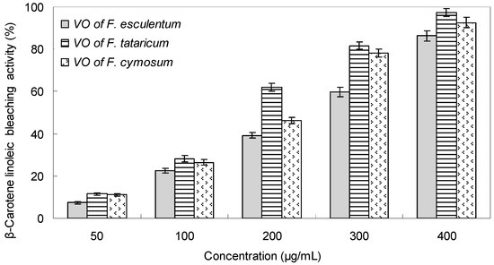 Both 1,1-diphenyl-2-picrylhydrazyl radical (DPPH●) scavenging and β-carotene/linoleic acid bleaching assays were applied to evaluate the antioxidant activity of the volatile oils prepared from F. esculentum, F. tataricum and F. cymosum flowers. The DPPH is a stable free radical which can easily experience reduction in the presence of an antioxidant [24]. Generally, the three VOs exhibited obvious activity to reduce the radical DPPH into yellow colored diphenylpicrylhydrazine, and the scavenging ability was dependent on the VOs species and concentrations. As shown in Figure 1, with concentrations ranging from 50–400 μg/mL, the DPPH radical scavenging capacity were from 6.62% to 57.36% for the flower VOs of F. esculentum, and from 10.62% to 91.43% for the F. tataricum VOs, and ranging from 10.72% to 76.48% for the F. cymosum VOs. Correspondingly, their IC50 value was determined as 354.15 μg/mL, 210.63 μg/mL, and 264.92 μg/mL, respectively (Table 4).
