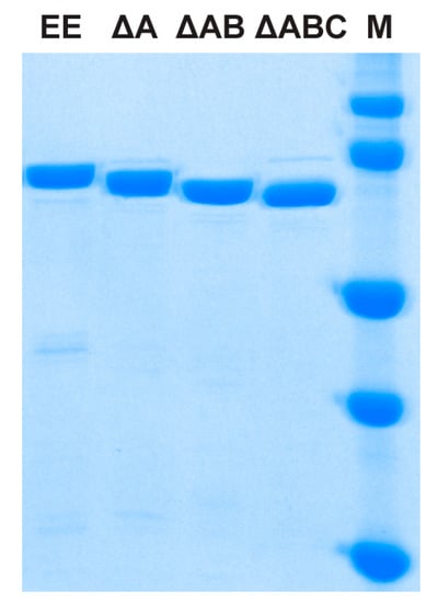 MBP-TtProDH EE, ΔA, ΔAB and ΔABC were overproduced in E. coli TOP10 cells. From 1 L of culture about 200–250 mg of each variant was purified, yields that we have described before for the heterologous production of MBP-TtProDH [17,19]. From SDS-PAGE analysis of the purified enzymes, it can be appreciated that sequential removal of three helices results in a gradual decrease of subunit molecular mass (Figure 2).