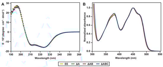 Spectral properties of EE, ΔA, ΔAB, and ΔABC. (A) Far-UV CD spectra; (B) Visible flavin absorption spectra.