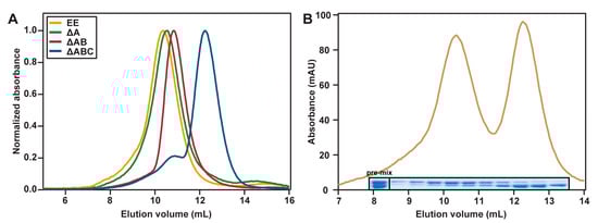 Hydrodynamic properties of EE, ΔA, ΔAB, and ΔABC as monitored by Superdex 200 size-exclusion chromatography. (A) Elution pattern of the MBP-TtProDH variants; (B) Hydrodynamic properties of EE and ΔABC, mixed in equal amounts and equilibrated at room temperature overnight. SDS-PAGE of the gel filtration fractions is also shown.