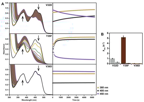 The far-UV CD spectra of V32D, Y35F, and V36D (Figure 8A) are identical to the far-UV CD-spectra of the N-terminal variants (Figure 3A). The visible flavin absorption properties of the ΔAB variants show that the low energy absorption bands of V32D and V36D have shifted about 2 nm to higher wavelength, as compared to those of ΔAB and Y35F (Figure 3B and Figure 8B). Thus, the flavin absorption properties of V32D and V36D resemble those of ΔABC (Figure 3B).