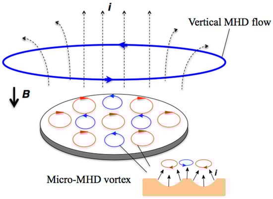 When a magnetic field B is imposed perpendicularly on a working electrode in an electrochemical cell, the Lorentz force acting on ionic currents i causes two types of magnetohydrodynamic (MHD) convections [], as shown in Figure 1 for the MEE process. The first one is termed a vertical MHD flow. This is a macroscopic flow around the electrode edge, in which the ionic currents are not parallel to the magnetic field. The second one is micro-MHD vortices excited locally around pits caused by the non-equilibrium fluctuation in etching processes. The micro-MHD vortices could affect the growth of chiral screw dislocations and thus contribute to the chiral surface formation. The micro-MHD vortices consist of both clockwise and anticlockwise flows, such that the adjoining flows never conflict with each other. The vertical MHD flow breaks such symmetrical micro-MHD state: The cyclonic micro-MHD vortices are stable, whereas anticyclonic ones become unstable [,]. The stable micro-MHD vortices could contribute to the formation of screw dislocations. The direction of vertical MHD flow depends on the magnetic field polarity. Thereby, the surface chirality sign should be opposite when the magnetic field is reversed, representing the odd magnetic field dependence of chirality [].
