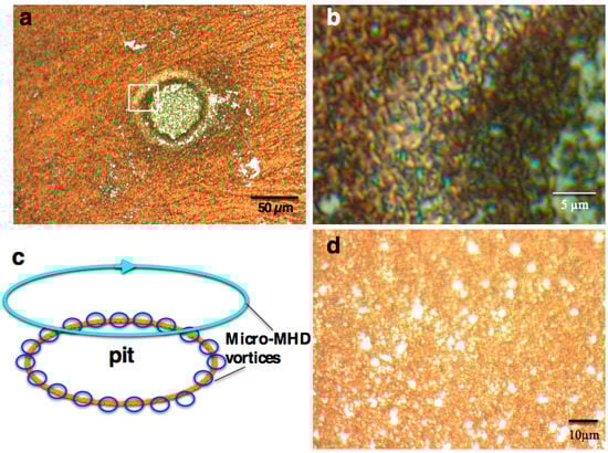 Microphotographs of MEE film surfaces prepared at a deposition current of 23 mA·cm−2. (a) +5T-film around a pit; (b) zoom-in photograph at the edge of pit (the rectangle part in (a)); (c) schematic of multi-scale micro-MHD vortices around a pit; (d) 0T-film.