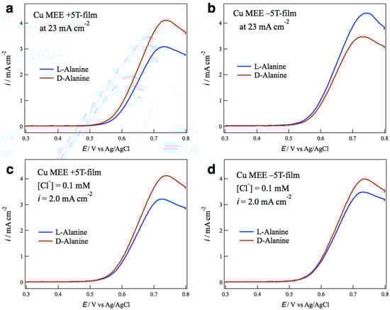 Chiral behaviors of the MEE film electrodes for the oxidation of alanine enantiomers. (a) +5T-film prepared at a deposition current of 23 mA·cm−2 without KCl; (b) −5T-film at 23 mA·cm−2 without KCl; (c) +5T-film at 20 mA·cm−2 with 0.1 mM KCl; and (d) −5T-film at 20 mA·cm−2 with 0.1 mM KCl.