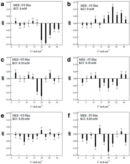 where ipL and ipD represent the peak currents of l- and d-alanines, respectively. The positive sign of ee ratio represents l-activity, and the negative sign represents d-activity. Figure 4 shows the ee ratio profiles (the ee ratio versus the deposition current) for the MEE ±5T-films prepared with KCl additives of 0, 0.1, and 0.2 mM. In the absence of KCl, the +5T-film shows d-activity in the current range of 20–30 mA·cm−2 (Figure 4a), whereas the −5T-film shows l-activity in the same current range (Figure 4b), representing clear odd magnetic field dependence. On the other hand, in the case of 0.1 mM KCl additives, both the +5T- and −5T-films exhibit d-activity in the current range of 15–20 mA·cm−2 (Figure 4c,d). Moreover, in the case of higher KCl concentration of 0.2 mM, the +5T-film shows slight d-activity in the range of 5–15 mA·cm−2 (Figure 4e), and the −5T-film shows clear d-activity in the almost whole current range (Figure 4f). At both KCl concentrations, the ee profiles represent the chiral symmetry breaking for the magnetic field polarity.