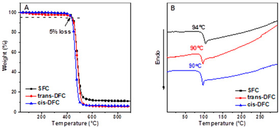 Thermogravimetric analysis (TGA) (A) anddifferential scanning calorimetry (DSC) (B) graphs of SFC, trans-DFC and cis-DFC.