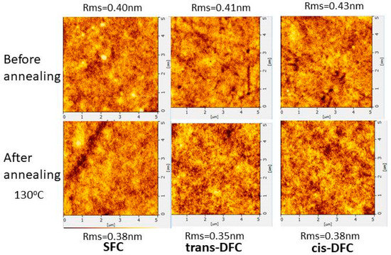 AFM images of SFC, trans-DFC and cis-DFC on indium tin oxide (ITO) at room temperature (up) and after annealing at 130 °C for 30 min (down).