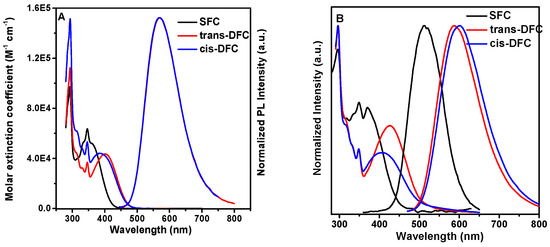 (A) The UV–vis and PL spectra in diluted THF solution of SFC, trans-DFC and cis-DFC (concentration: 1 × 10−5 mol L−1); (B) The UV–vis and PL spectra in films of SFC, trans-DFC, and cis-DFC.