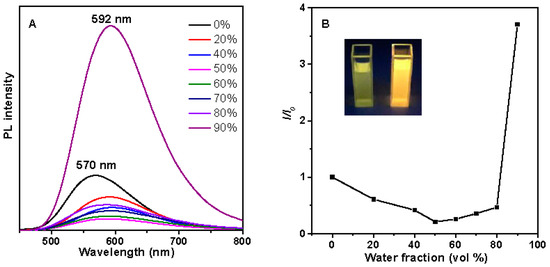 (A) PL spectra of trans-DFC in THF–water mixtures with different water fractions (fw); (B) Plot of the relative PL intensity (I/I0) versus the compositions of THF–water mixtures of trans-DFC. I0 = emission intensity in pure THF solution. Inset in (B) are the fluorescent photographs at fw = 0 and 95% taken under a 365 nm UV lamp.