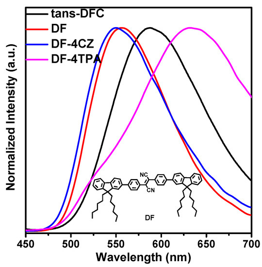 The PL spectra in films of trans-DFC, 2,3-bis(4-(9,9-dihexyl-9H-fluoren-2-yl)phenyl)fumaronitrile (DF), and DF dispersed in carbazole with a mole ratio of 1:4. Inset: the structure of DF. (CZ = carbazole; TPA = triphenylamine).